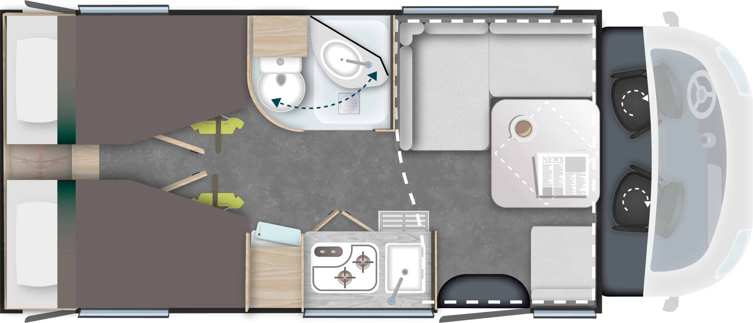 • Swivel seats in the cab, with double armrests and adjustable height